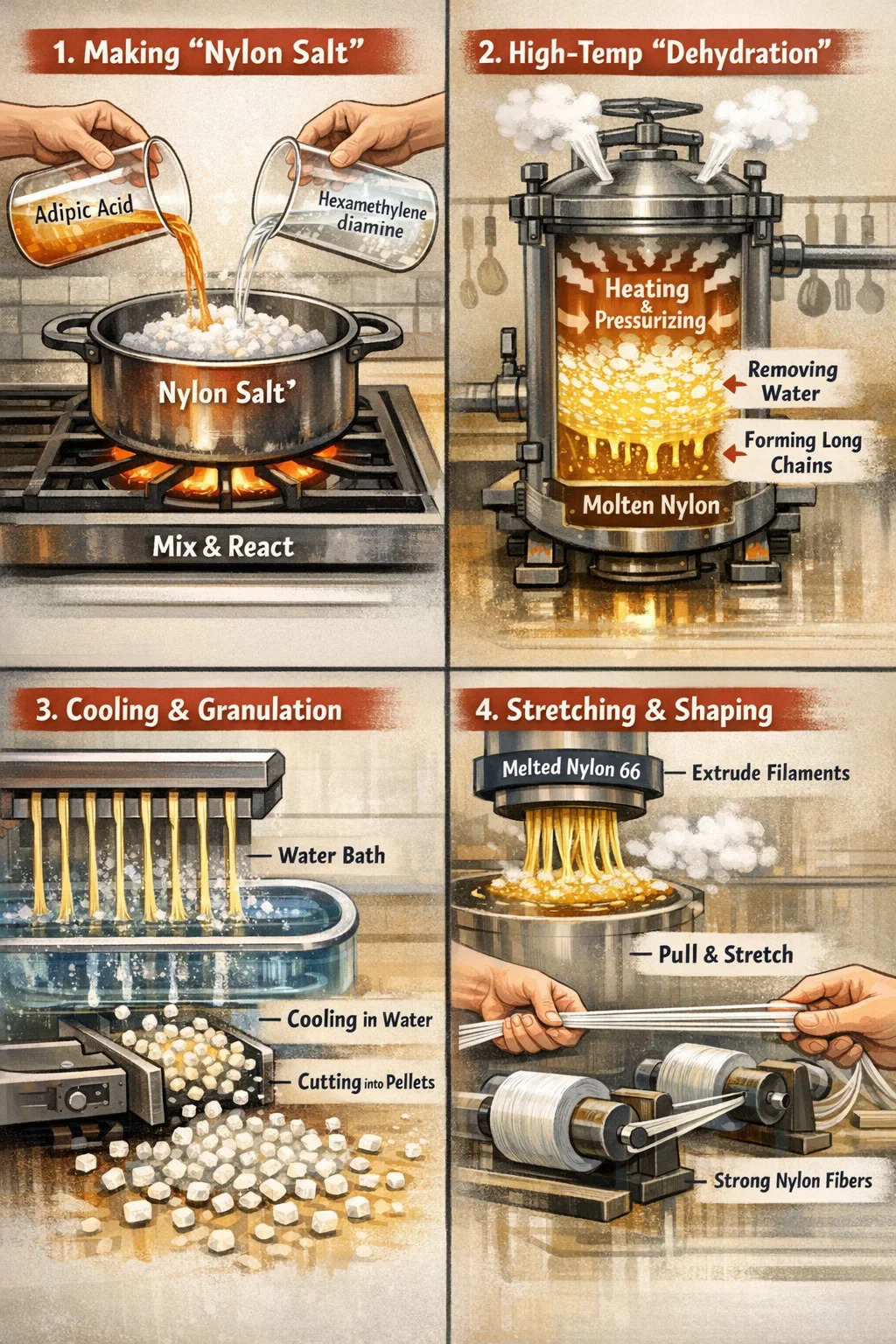 나일론 66 폴리아미드 66으로도 알려져 있는 는 세계에서 가장 널리 사용되는 엔지니어링 플라스틱 중 하나입니다. 생산 과정은 주방에서 '국 만들기', '국수 뽑기'와 같으며 정확한 비율과 제어된 가열을 강조합니다.