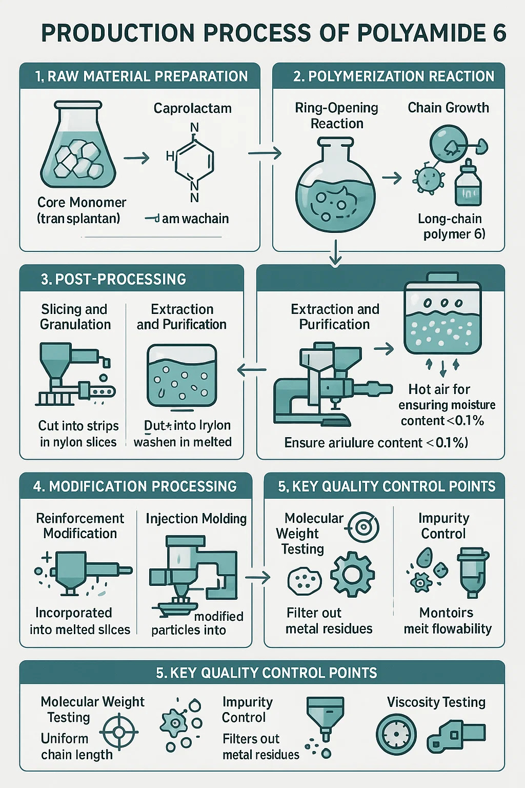 코어 모노머: 카프로락탐(투명한 결정)은 석유에서 추출한 벤젠을 다단계 반응을 통해 생산합니다.