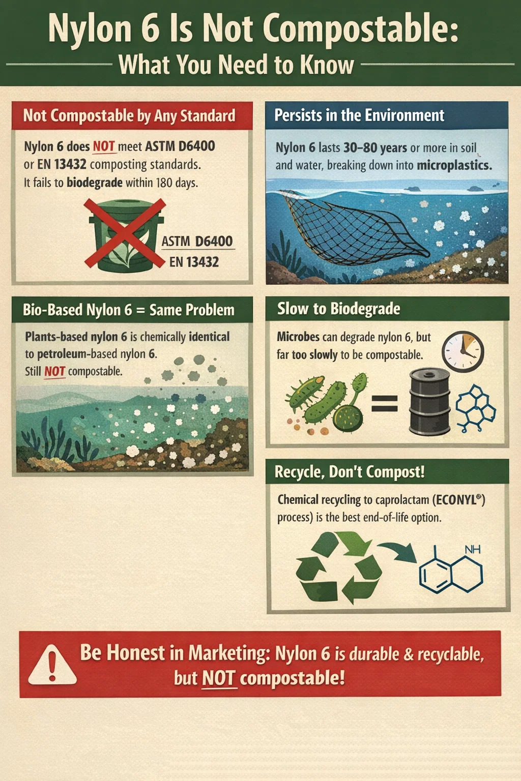 - 나일론 6가 포함된 제품에 퇴비화 가능, 생분해성 또는 "자연으로의 복귀" 라벨을 붙이지 마십시오. 이는 부정확하며 많은 시장에서 녹색 청구법에 따른 규제 위반에 해당합니다.