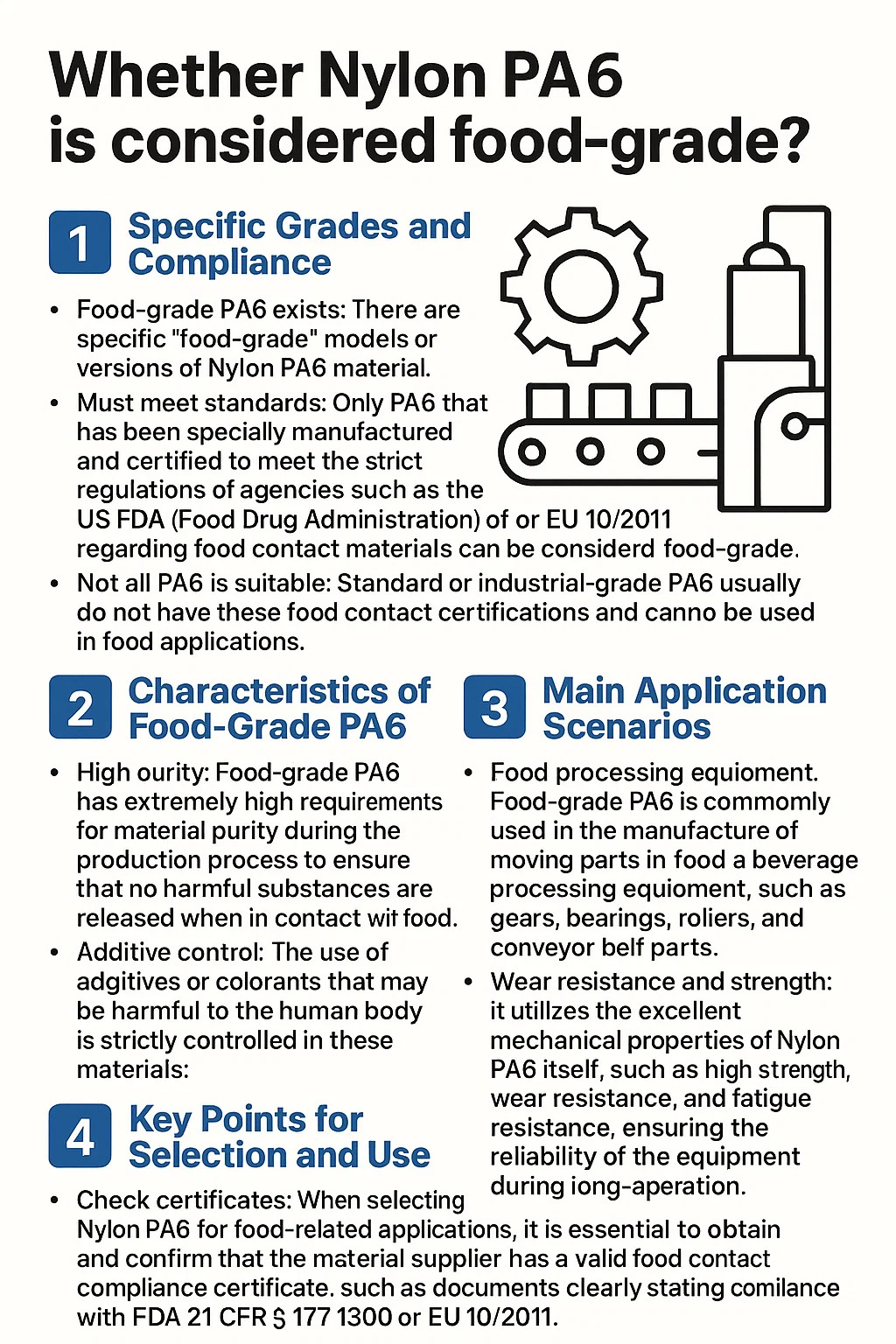 나일론 PA6이 식품 등급으로 간주되는지 여부는 다음 측면에서 결정할 수 있습니다.