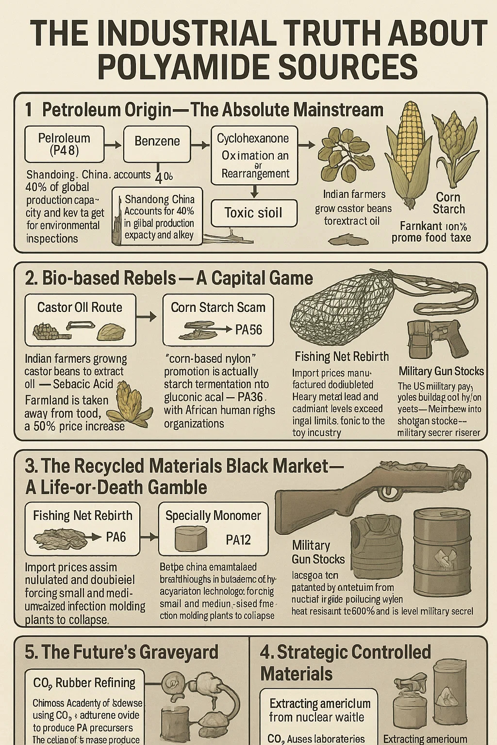 카프로락탐(PA6 전구체): 석유 → 벤젠 → 시클로헥사논 → 산화 및 재배열, 부산물로 황산암모늄 및 독성 토양 포함. 중국 산둥성은 전 세계 생산능력의 40%를 차지하며 환경검사의 주요 대상이다.