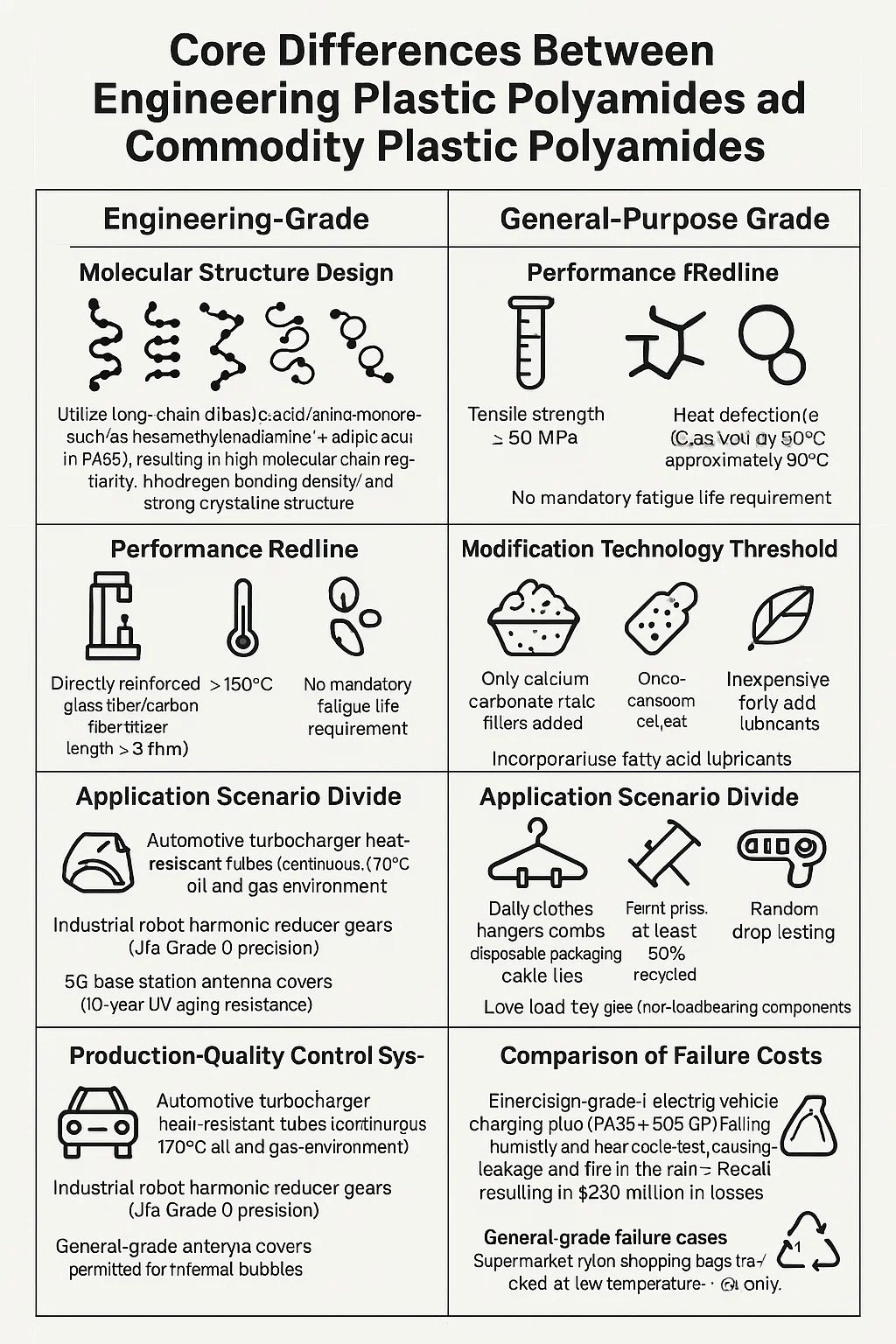 엔지니어링-등급 : 장쇄 디바 산/아민 단량체 (예 : PA66의 헥사 메틸렌 디아민 아 디프 산과 같은)를 이용하여 고 분자 사슬 규칙 성, 높은 수소 결합 밀도 및 강한 결정 구조를 초래합니다.
