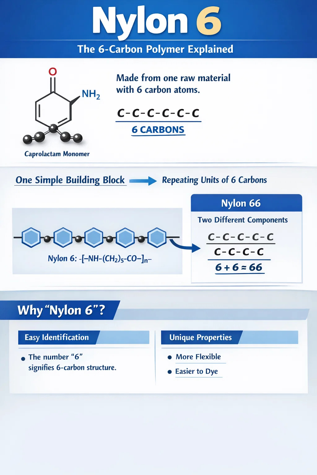 명명 논리: 이 6개의 탄소 원자만이 긴 사슬 전체를 구성하는 데 관여하기 때문에 편의와 암기 용이성을 위해 과학자와 제조업체는 이를 단순히 "나일론 6"이라고 불렀습니다.